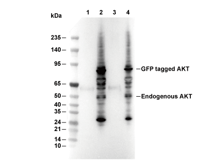 • Lane 1: 293T (transfected with Empty vector), Lane 2: 293T (transfected with GFP tagged AKT1), Lane 3: 293T (transfected with GFP tagged AKT2), Lane 4: 293T (transfected with GFP tagged AKT3)