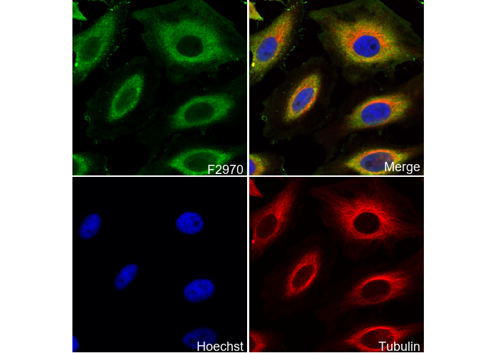 • Immunofluorescent analysis of Hela cells using F2970 (green, 1:200), Hoechst (blue) and tubulin (Red).