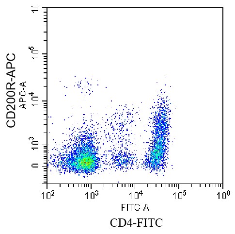• Staining of normal human peripheral blood mononuclear cells (PBMCs) with APC anti-human CD200R Antibody (Clone: OX108) (Product Code: H2883) and FITC anti-human CD4 Antibody. Analysis data derived from lymphocytes.
