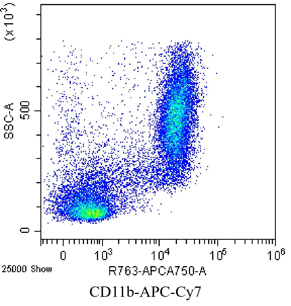 • Staining of bone marrow cells from C57BL/6 mice using APC-Cy7 mouse/human CD11b Antibody [M1/70] (Selleck Cat.: G4671). Analyzed data are derived from live total cells.