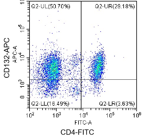• Staining of normal human peripheral blood mononuclear cells (PBMCs) with APC anti-human CD132 common γ chain Antibody (Clone: TUGh4) (Product Code: H2898) and FITC anti-human CD4 Antibody. Analysis data derived from live lymphocytes.