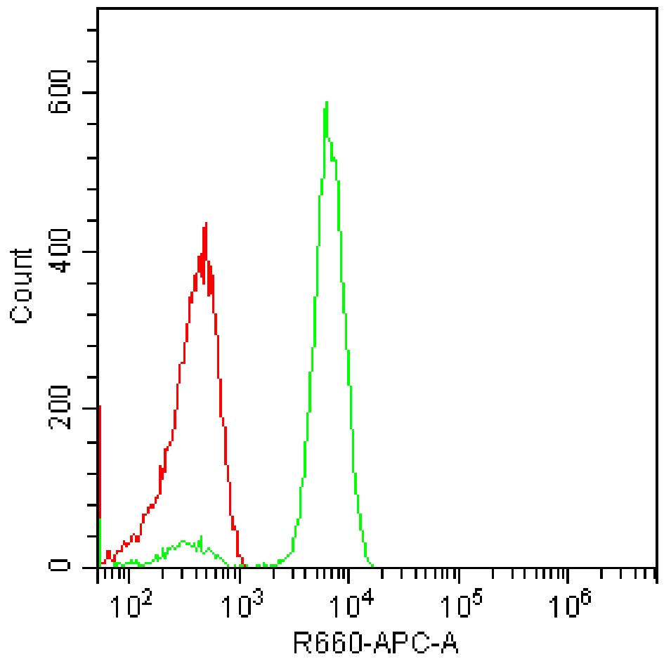 • Fixation of Jurkat cells with 4% formaldehyde, after washing, cells were permeabilized by adding 1000 μL of pre-cooled 90% methanol, followed by washing, and then staining of cells using APC Human/mouse/rat p44/42 MAPK Antibody [B5N16] (Selleck Cat.: G4968) (green, with red blank control). Analyzed data are derived from all cells with intact scatter.