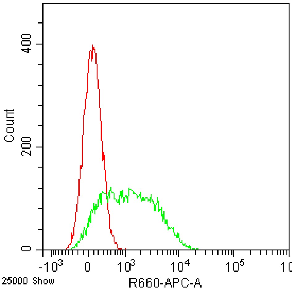 • Staining of C57BL/6 spleen stimulated with IgM+CD40 for 3 days using APC Mouse CD252/OX40L Antibody [RM134L] (Selleck Cat.: G2058) (green, with red blank control). Analyzed data are derived from live total cells.
