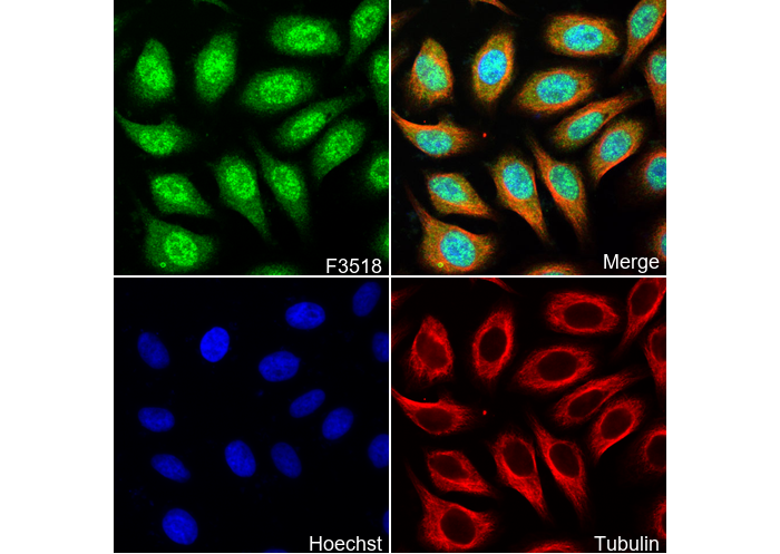 • Immunofluorescent analysis of MCF7 cells using F3518 (green, 1:100 ), Hoechst (blue) and tubulin (Red).