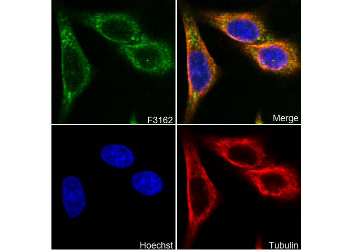 • Immunofluorescent analysis of PC-12 cells using F3162 (green, 1:100), Hoechst (blue) and tubulin (Red).