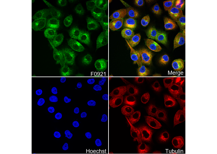 • Immunofluorescent analysis of PANC-1 cells using F0921 (green, 1:100), Hoechst (blue) and tubulin (Red).