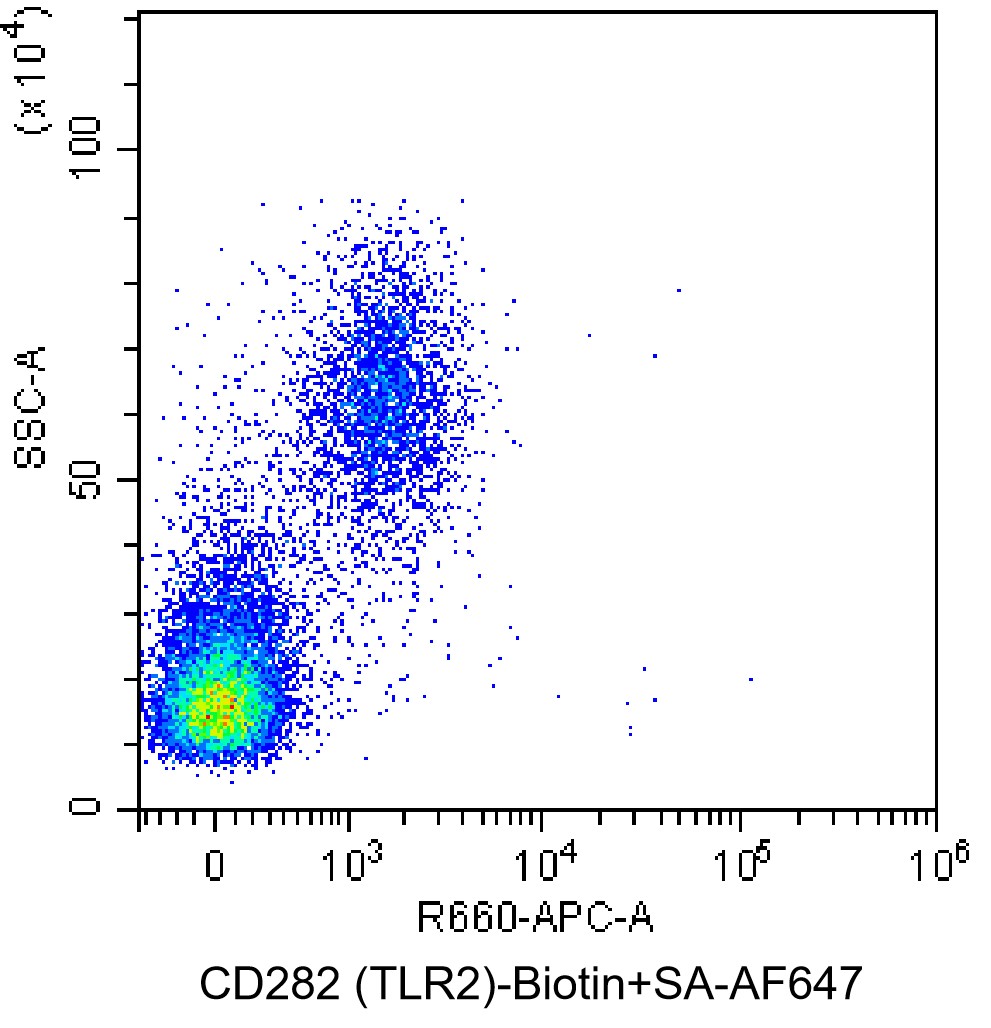 • Staining normal human peripheral blood mononuclear cells (PBMCs) with biotin CD282/TLR2 Antibody (Clone: TL2.1) (Product Number: H3585) and SA-AF647. Analysis was performed on total live cells.