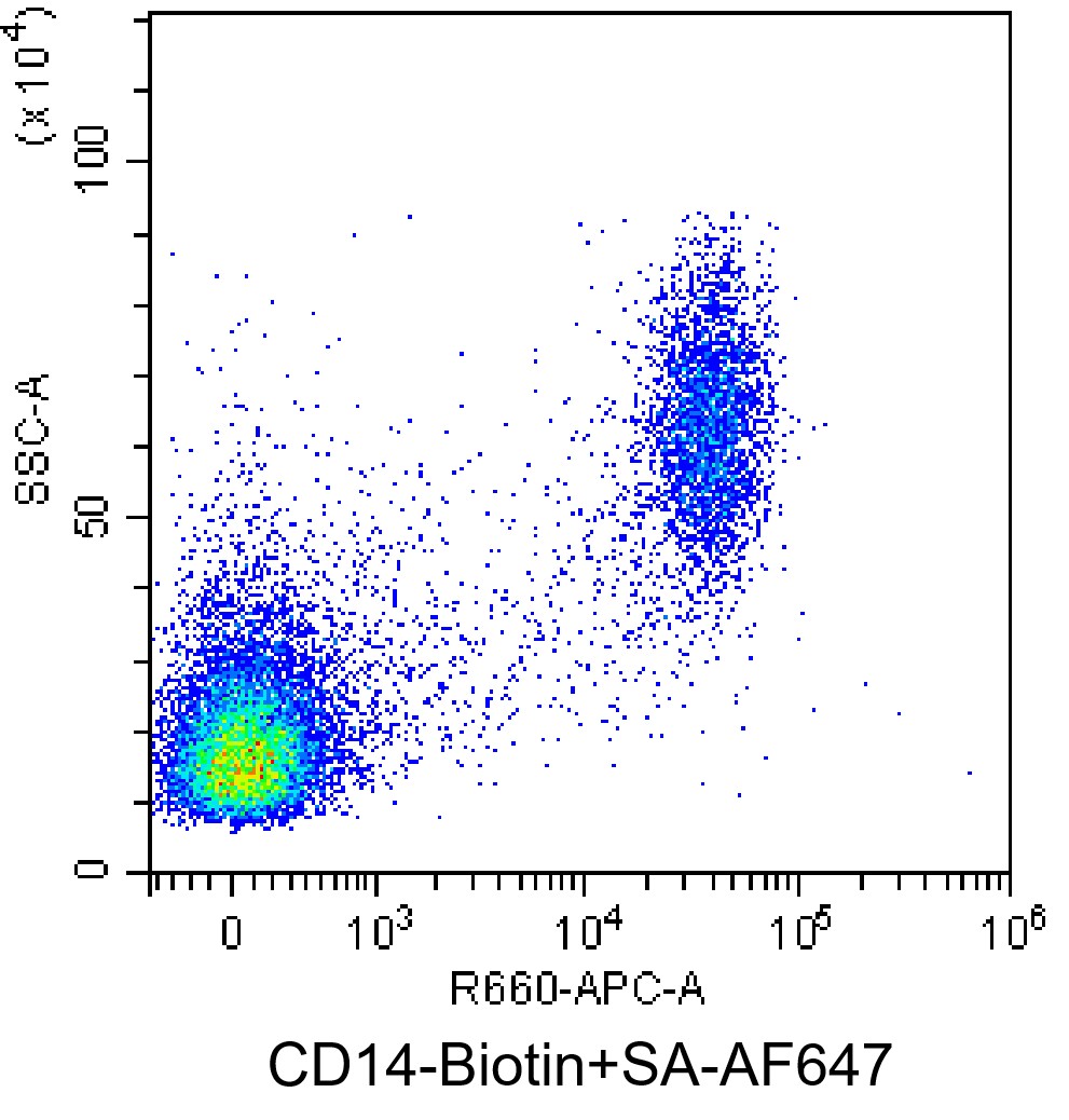 • Staining normal human peripheral blood mononuclear cells (PBMCs) with biotin Human CD14 Antibody (Clone: M5E2) (Product Number: H0195) and SA-AF647. Analysis was performed on live cells.