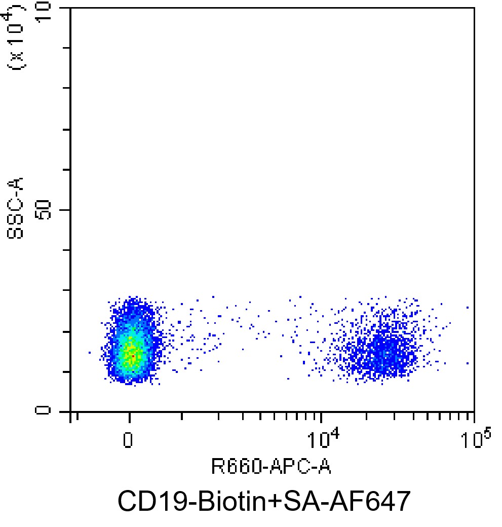 • Staining normal human peripheral blood mononuclear cells (PBMCs) with biotin Human CD19 Antibody (Clone: LT19) (Product Number: H0030) and SA-AF647. Analysis was performed on lymphocytes.