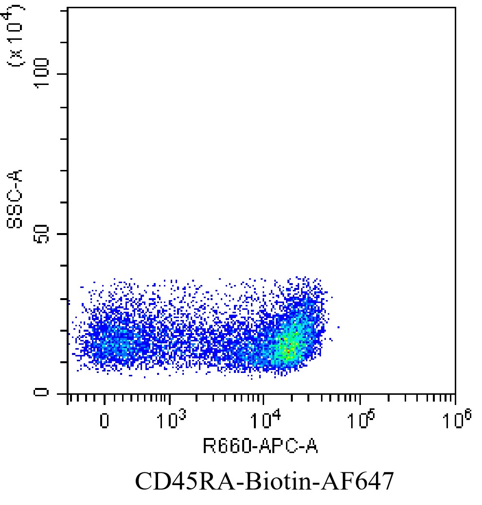 • Staining normal human peripheral blood mononuclear cells (PBMCs) with biotin Human CD45RA Antibody (Clone: HI100) (Product Number: H0750), SA-AF647. Analysis was performed on lymphocytes.