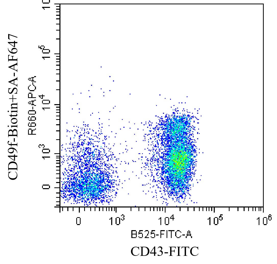 • Staining normal human peripheral blood mononuclear cells (PBMCs) with FITC CD3 Antibody and biotin Human CD49f Antibody (Clone: GoH3) (Product Number: H0540), SA-AF647. Analysis was performed on lymphocytes.