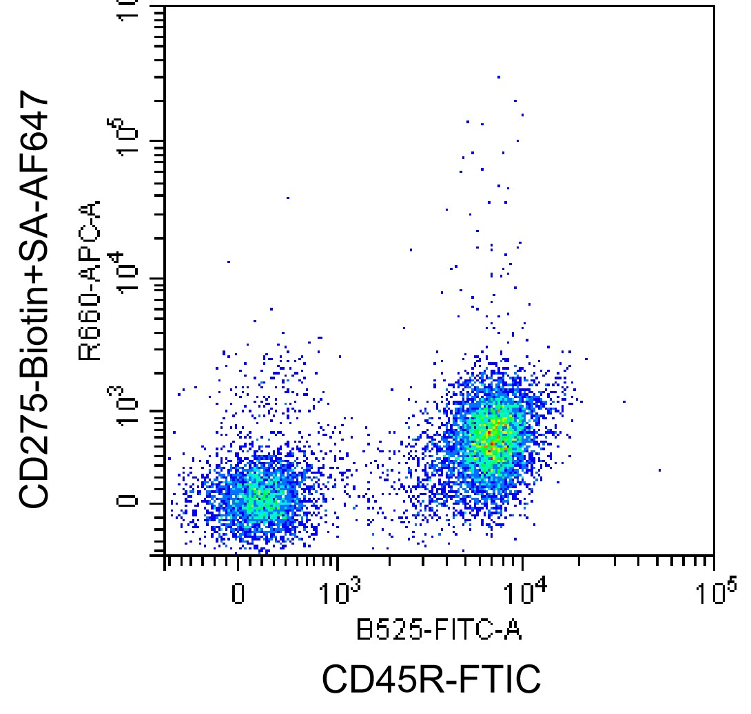 • Staining normal human peripheral blood mononuclear cells (HPBMCs) stimulated with 1μg/mL LPS for one day with biotin mouse CD275 Antibody (Clone: HK5.3) (Product Number: G4920), SA-AF647 and FITC CD45R Antibody (green, red is unstained control). Analysis was performed on total live cells.
