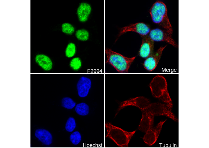 • Immunofluorescent analysis of 293T cells using F2994 (green, 1:250), Hoechst (blue) and tubulin (Red).