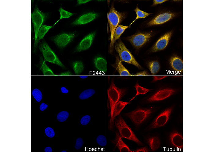 • Immunofluorescent analysis of Hela cells using F2443 (green, 1:50), Hoechst (blue) and tubulin (Red).