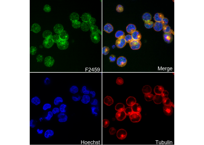 • Immunofluorescent analysis of K562 cells using F2459 (green, 1:150), Hoechst (blue) and tubulin (Red).