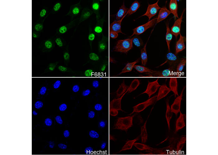 • Immunofluorescent analysis of NIH/3T3 cells using F6831 (green, 1:200), Hoechst (blue) and tubulin (Red).