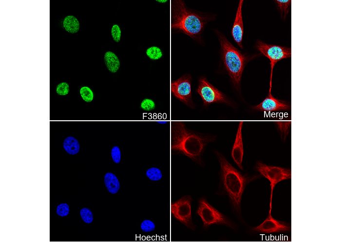 • Immunofluorescent analysis of Hela cells using F3860 (green, 1:100), Hoechst (blue) and tubulin (Red).