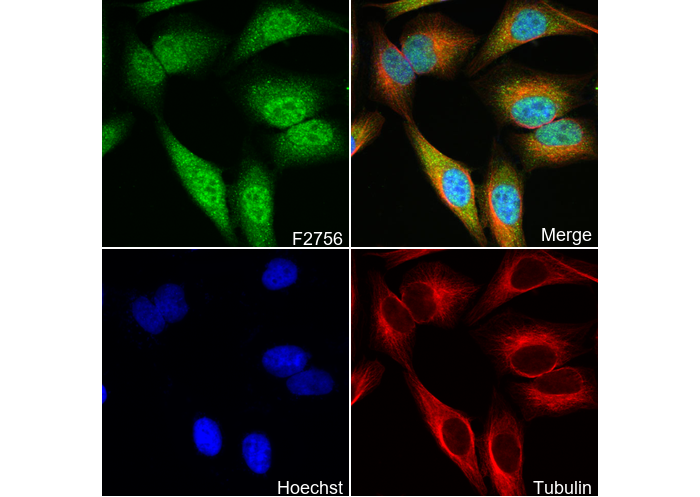 • Immunofluorescent analysis of Hela cells using F2756 (green, 1:500), Hoechst (blue) and tubulin (Red).