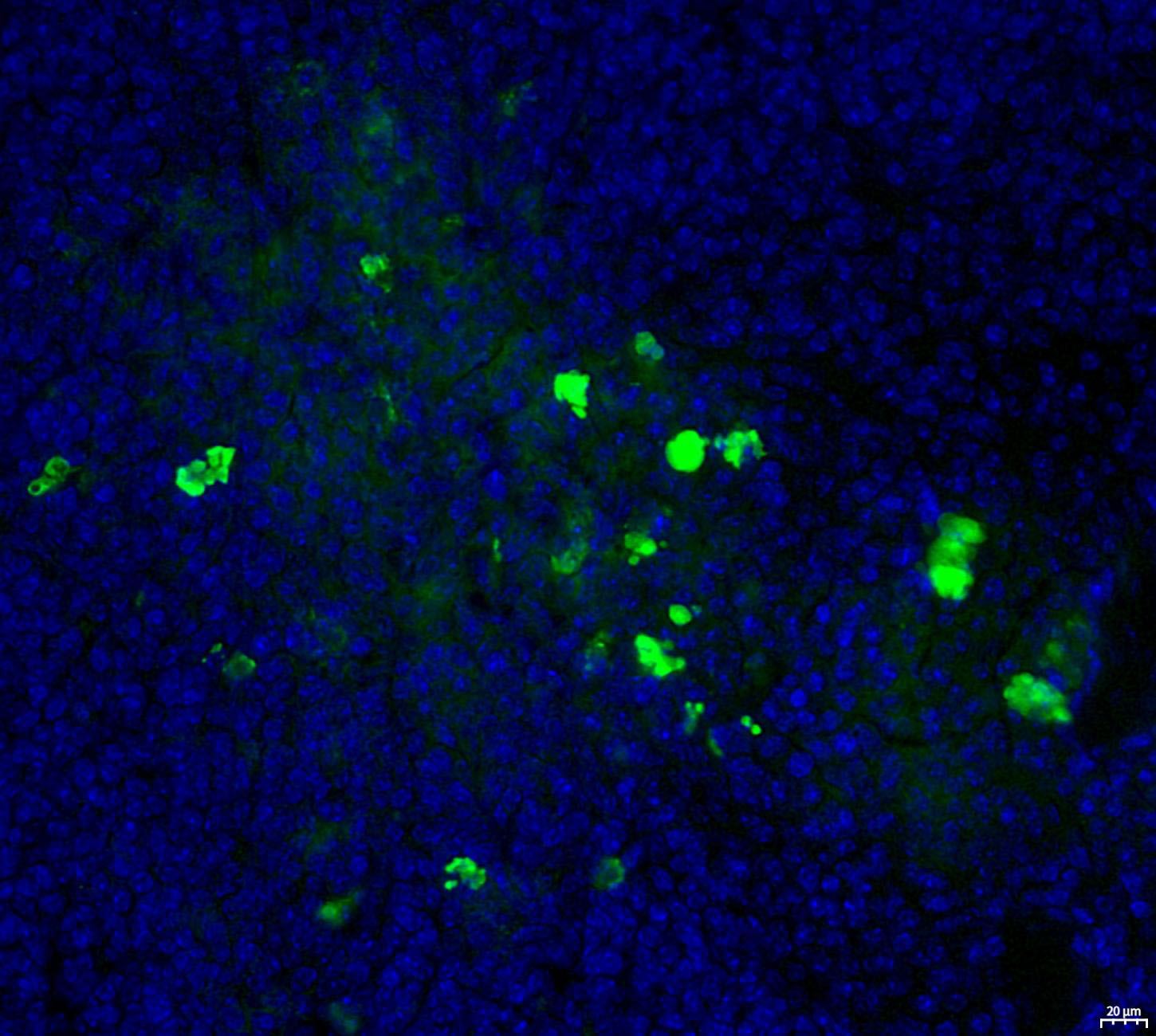 • Immunofluorescent analysis of Mouse spleen tissue using F1536 (green, 1:200) and Hoechst (blue).