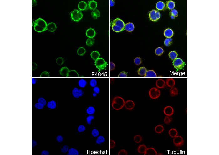 • Immunofluorescent analysis of Jurkat cells using F4645 (green, 1:50), Hoechst (blue) and tubulin (Red).