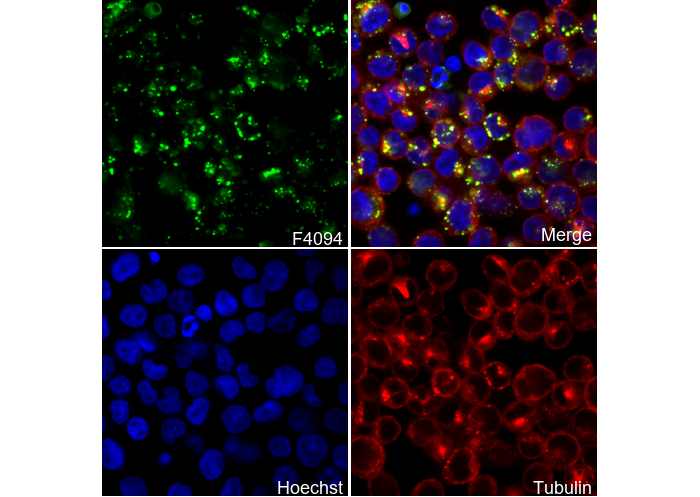 • Immunofluorescent analysis of Raji cells using F4094 (green, 1:200), Hoechst (blue) and tubulin (Red).