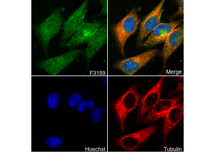 • Immunofluorescent analysis of Hela cells using F3159 (green, 1:200), Hoechst (blue) and tubulin (Red).