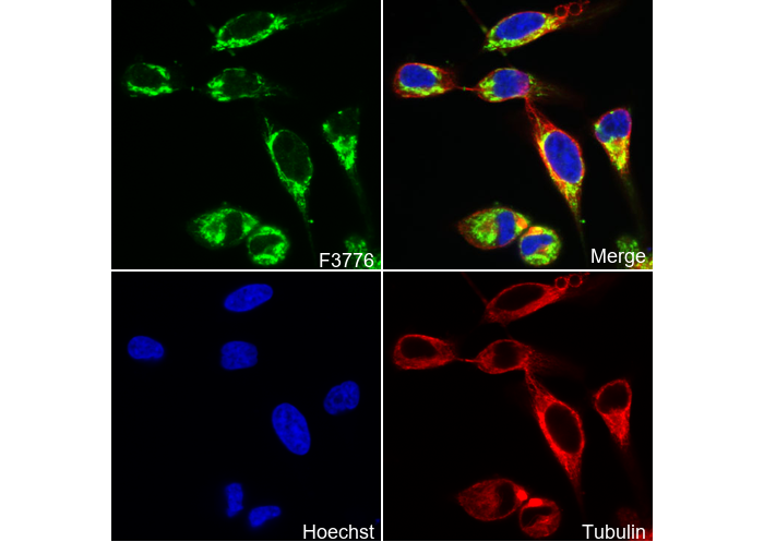 • Immunofluorescent analysis of Hela cells using F3776 (green, 1:100), Hoechst (blue) and tubulin (Red).