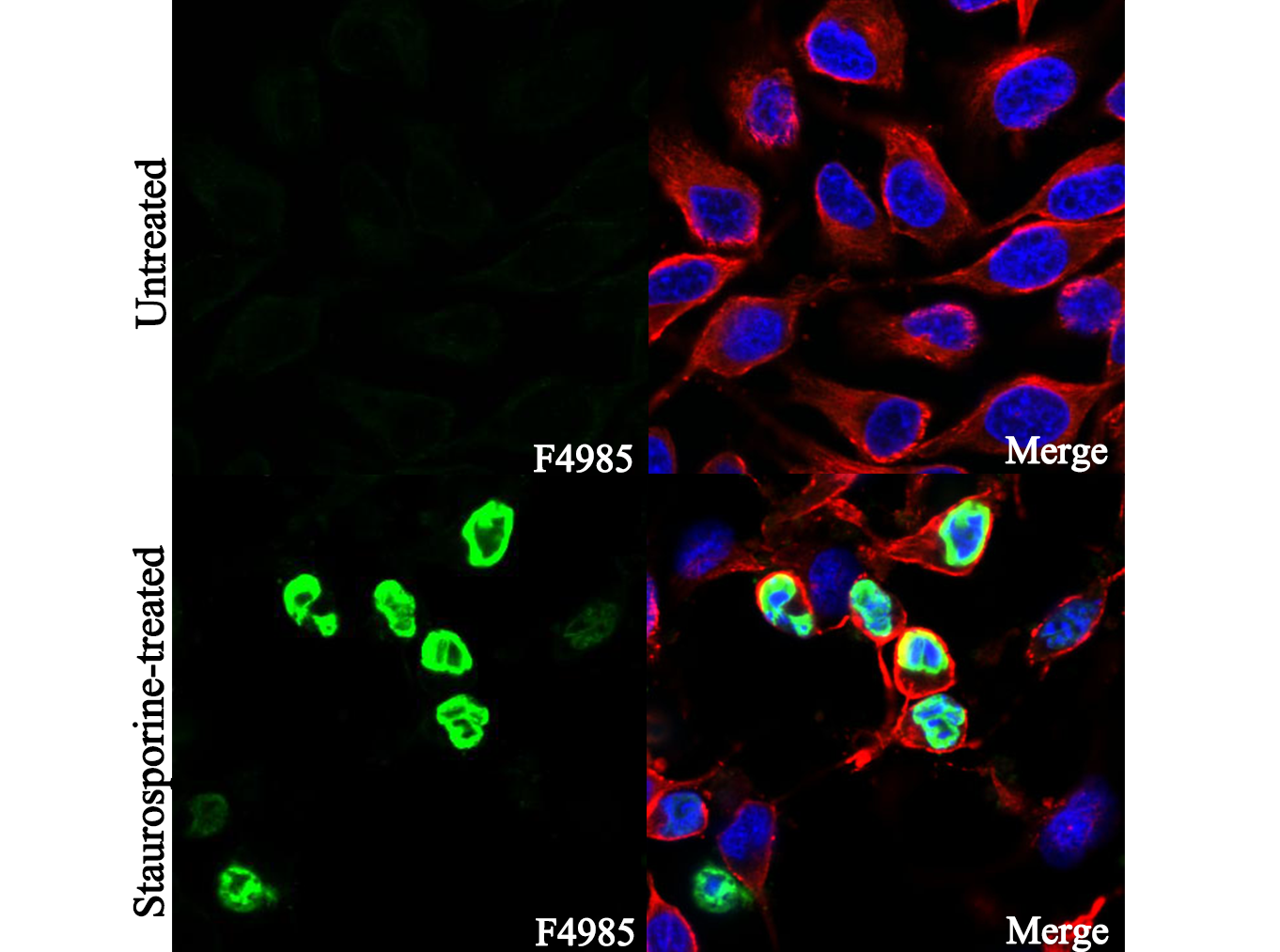 • Immunofluorescent analysis of Hela cells, untreated (upper) and Staurosporine-treated(2 µM, 3h)(lower), using F4985 (green, 1:800), Hoechst (blue) and tubulin (Red).