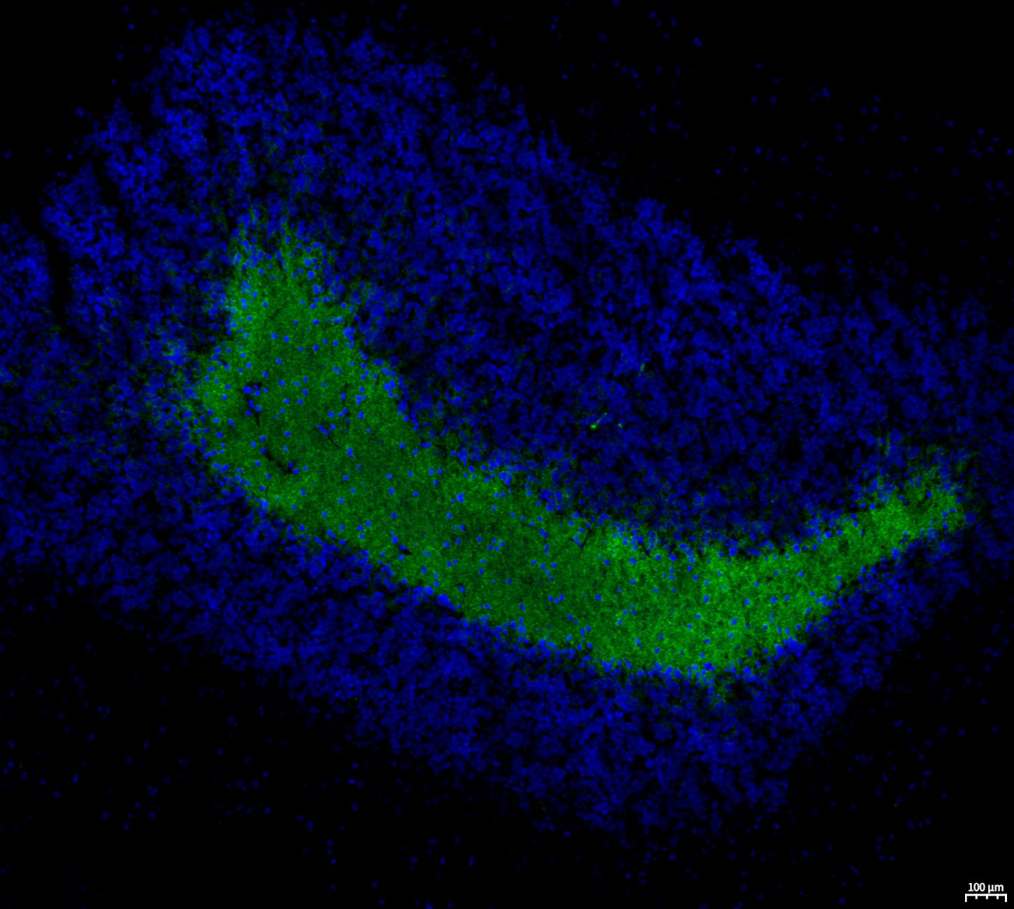 • Immunofluorescent analysis of Rat cerebellum tissue using F0624 (green, 1:50) and Hoechst (blue).