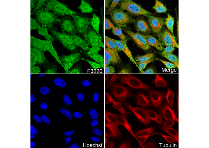 • Immunofluorescent analysis of Hela cells using F3226 (green, 1:200), Hoechst (blue) and tubulin (Red).