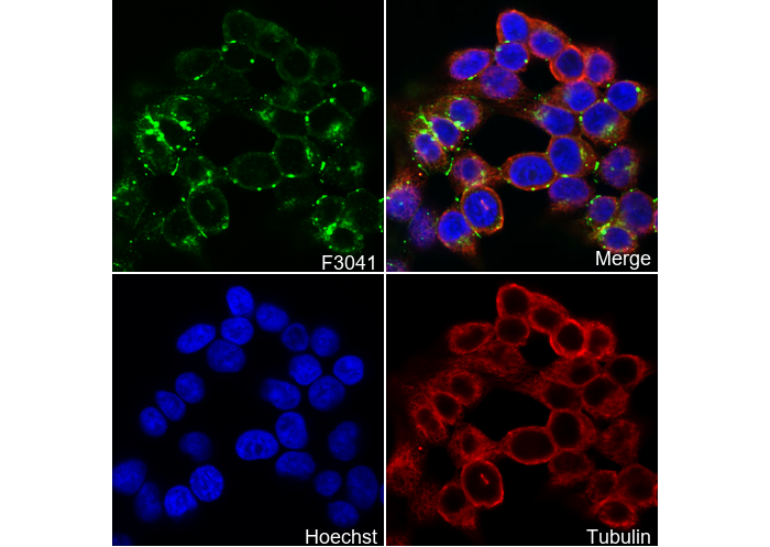 • Immunofluorescent analysis of 293T cells using F3041 (green, 1:400), Hoechst (blue) and tubulin (Red).