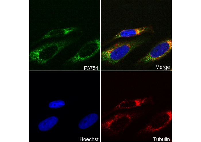 • Immunofluorescent analysis of Hela cells using F3751 (green, 1:100), Hoechst (blue) and tubulin (Red).