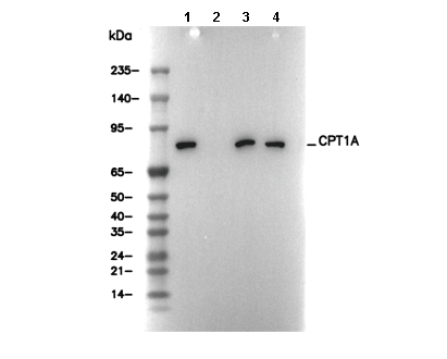 • Lane 1: HEK-293T, Lane 2: HEK-293T (KO CPT1A), Lane 3: Hela, Lane 4: MCF7