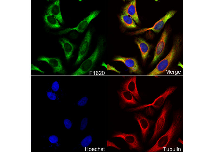 • Immunofluorescent analysis of Hela cells using F1620 (green, 1:1000), Hoechst (blue) and tubulin (Red).