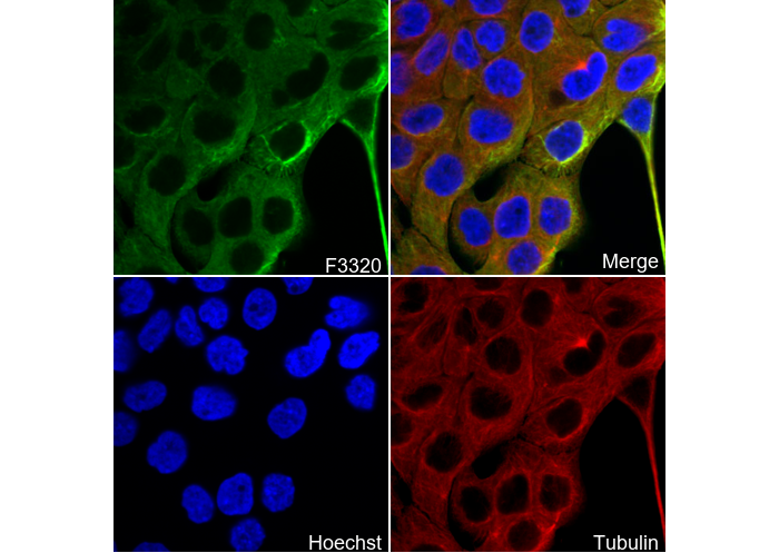• Immunofluorescent analysis of A431 cells using F3320 (green, 1:50), Hoechst (blue) and tubulin (Red).