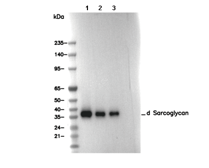 δ Sarcoglycan Antibody [K7B23] 可检测内源性 δ Sarcoglycan 总蛋白水平。