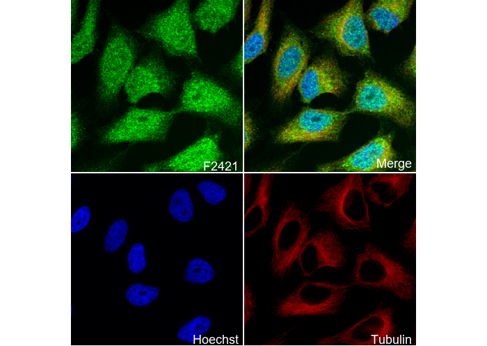 • Immunofluorescent analysis of Hela cells using F2421 (green, 1:100), Hoechst (blue) and tubulin (Red).