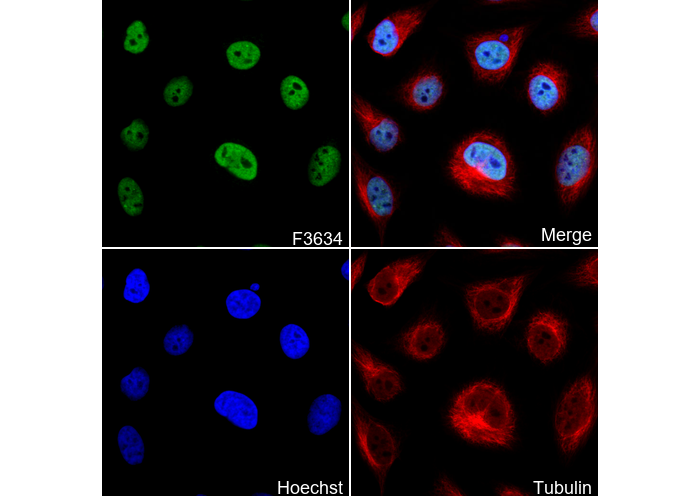 • Immunofluorescent analysis of Hela cells using F3634 (green, 1:500), Hoechst (blue) and tubulin (Red).