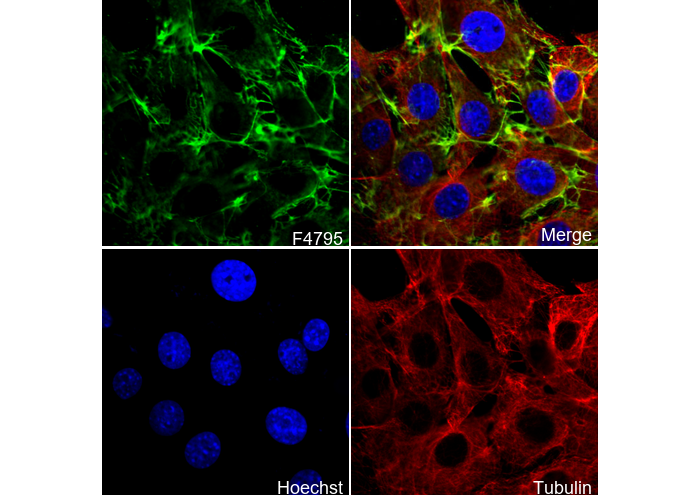 • Immunofluorescent analysis of NIH/3T3 cells using F4795 (green, 1:50), Hoechst (blue) and tubulin (Red).