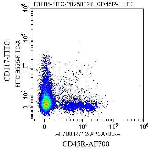 • Staining of C57B/6 mouse bone marrow cells with FITC anti-mouse CD117/c-Kit Antibody (Clone: ACK2) (Product Code: H4381) and anti-mouse CD45R-AF700. Analysis data derived from total live cells.