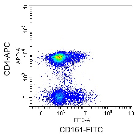• Staining of normal human peripheral blood mononuclear cells (PBMCs) using APC Anti-CD4 Antibody and FITC Anti-CD161 Antibody (Clone: HP-3G10) (Product No.: H0331). Analyzed data are derived from lymphocytes.