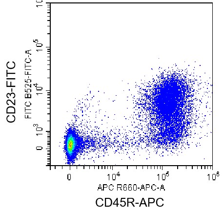 • Staining of splenic lymphocytes from C57BL/6 mice using APC Anti-CD45R Antibody and FITC Anti-CD23 Antibody (Clone: B3B4) (Product No.: G4126). Analyzed data are derived from live lymphocytes.