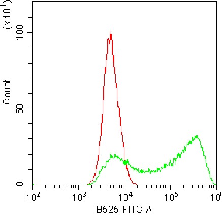 • Staining of permeabilized HEK-293F cells transfected with TWEAKR Lentiviral cDNA ORF plasmid using fixation/permeabilization buffer with FITC anti-human CD266 Antibody (Clone: ITEM-4) (Product Code: H3286) (green, red is unstained control). Analysis data derived from total cells.