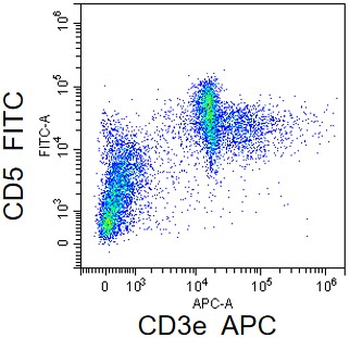 • Staining of splenic lymphocytes from C57BL/6 mice using APC Anti-CD3e Antibody and FITC Anti-CD5 Antibody (Clone: 53-7.3) (Product No.: G3481). Analyzed data are derived from total live cells.