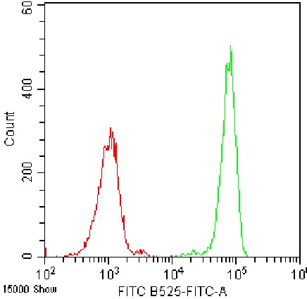 • Staining of normal human peripheral blood lysed with ammonium chloride red blood cell lysis buffer using FITC Anti-CD88 Antibody (Clone: S5/1) (Product No.: H1741) (green, red is blank control). Analyzed data are derived from total live cells.