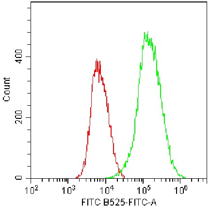 • Staining of J774A.1 cell line cells using FITC F4/80 Antibody (Clone: BM8) (Product No.: G0061) (Green, Red: Blank Control). Analyzed data are derived from total live cells.