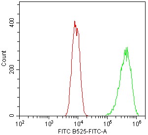 • Staining of fixed/permeabilized SKBR3 cell line cells using FITC Anti-HER2/ErbB2 Antibody (Clone: 29D8) (Product No.: G3736) (green, red is blank control). Analyzed data are derived from total cells.