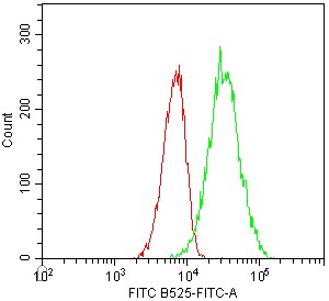 • Staining of Hela cell line cells using FITC Anti-Human CD146 Antibody (Clone: P1H12) (Product No.: H1036) (green, red is blank control). Analyzed data are derived from live cells.