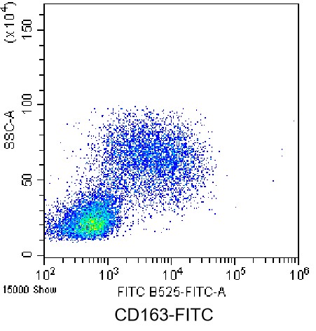 • Staining of normal human peripheral blood mononuclear cells (PBMCs) using FITC Anti-Human CD163 Antibody (Clone: GHI/61) (Product No.: H3496). Analyzed data are derived from total cells.