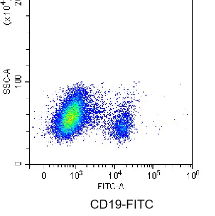 • Staining of normal human peripheral blood mononuclear cells (PBMCs) using FITC Anti-Human CD19 Antibody (Clone: HIB19) (Product No.: H0001). Analyzed data are derived from lymphocytes.